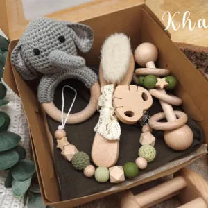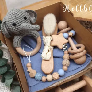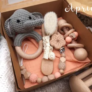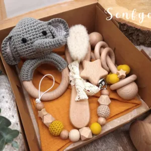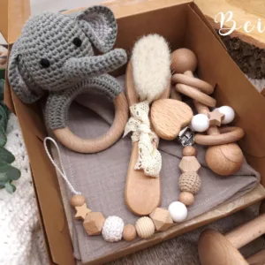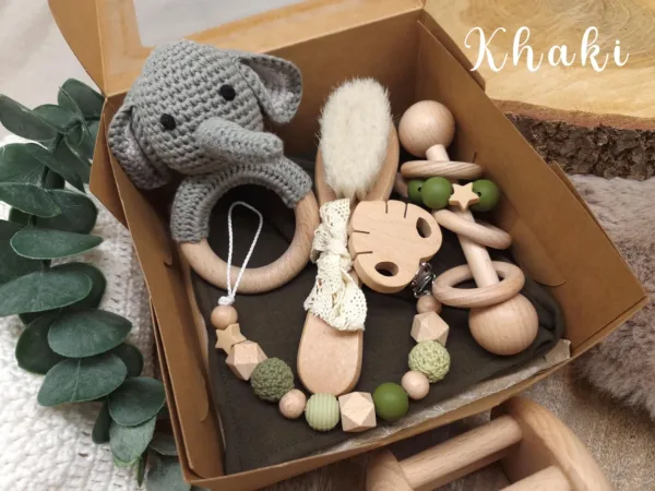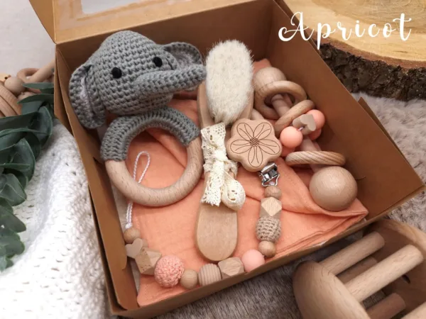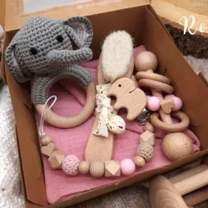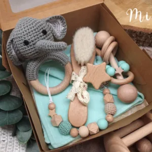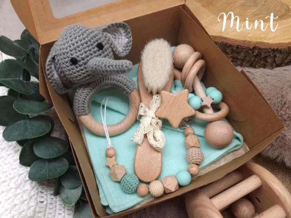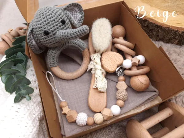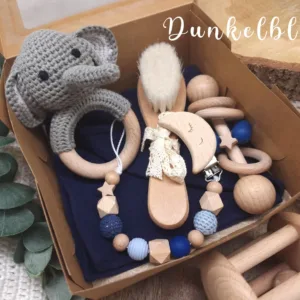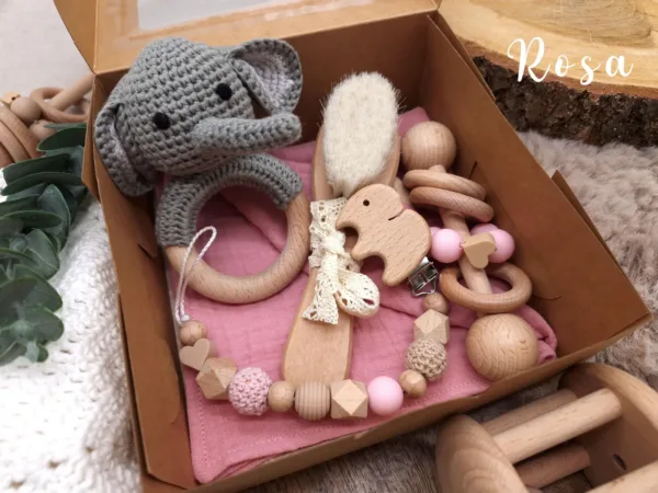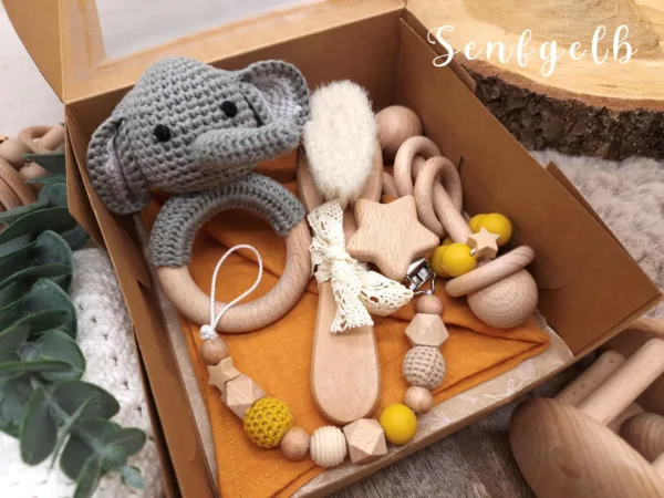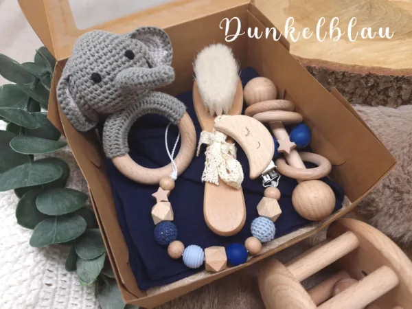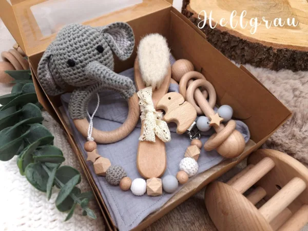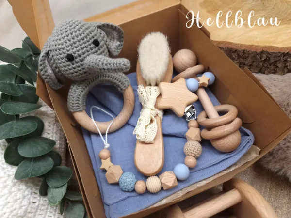 Geschenkbox „Elefant“ | Greifring | Schmusetuch | Stabrassel | Schnullerkette | Baby-Haarbürste