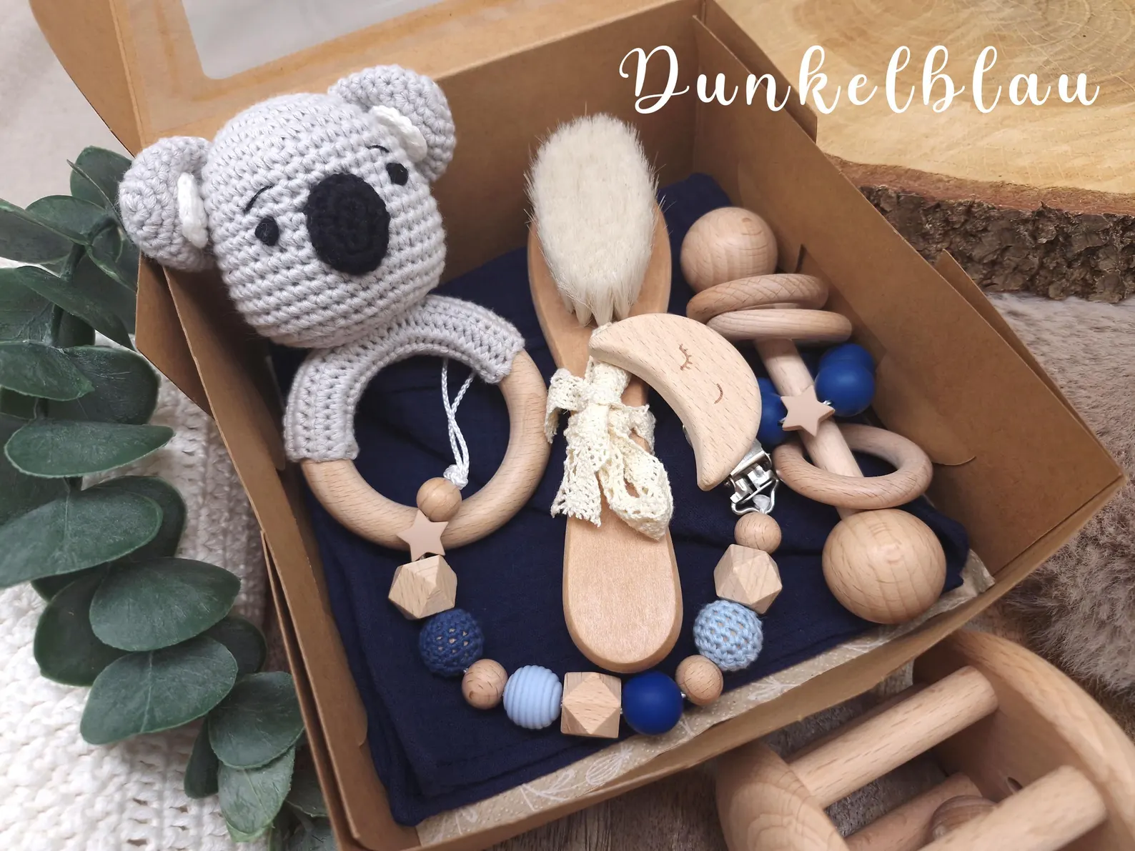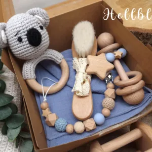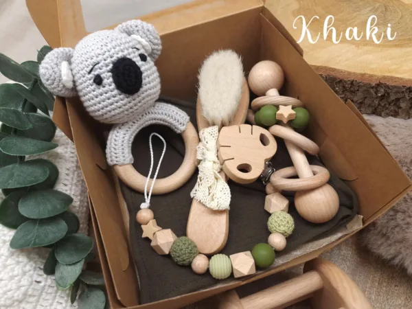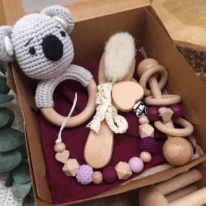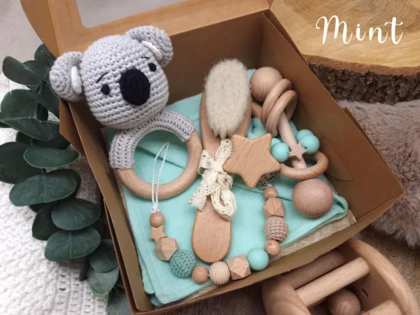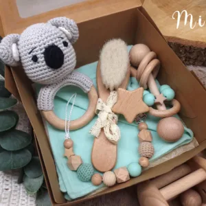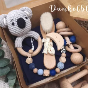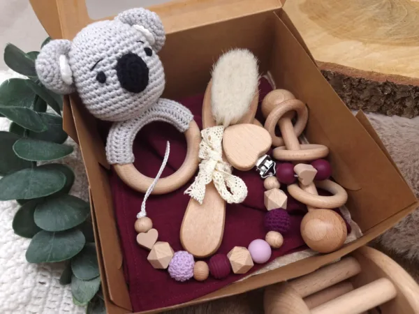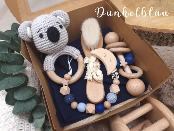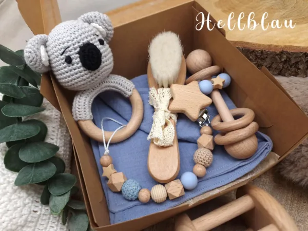 Geschenkbox „Koala“ | Greifring | Schmusetuch | Stabrassel | Schnullerkette | Baby-Haarbürste