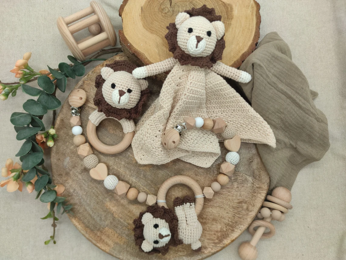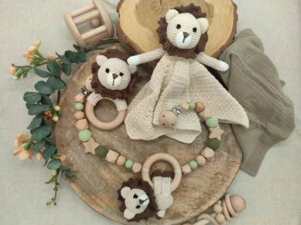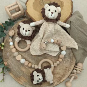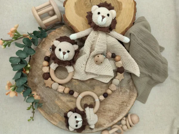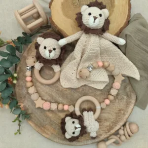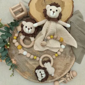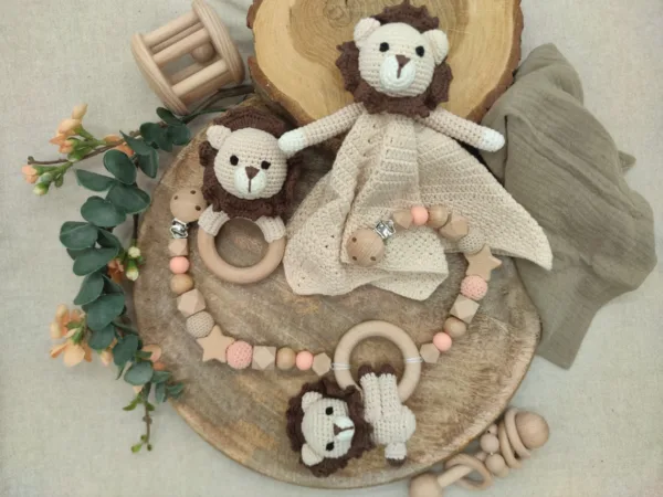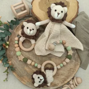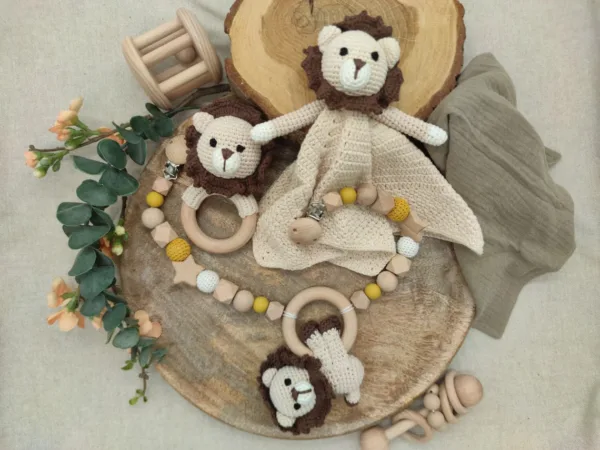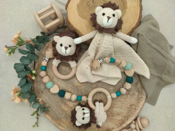 Geschenkset „Löwe“ | Schmusetuch | Rassel | Kinderwagenkette