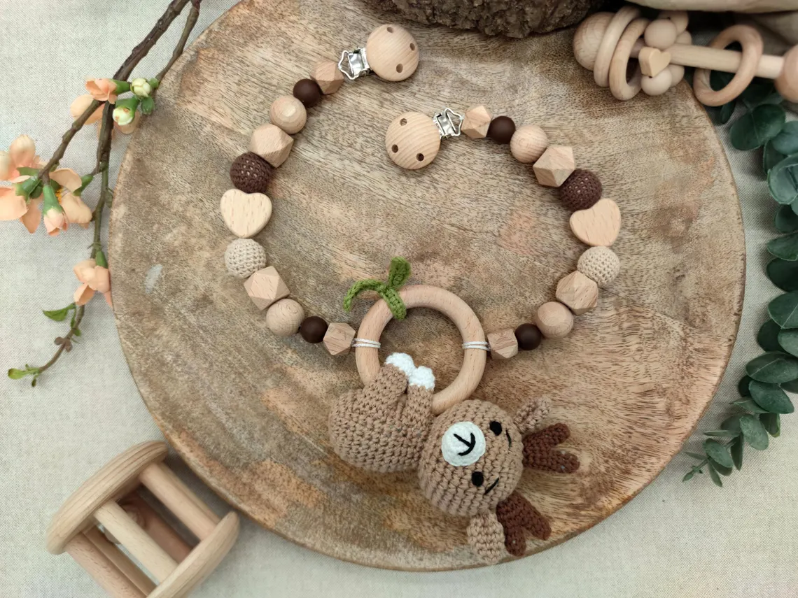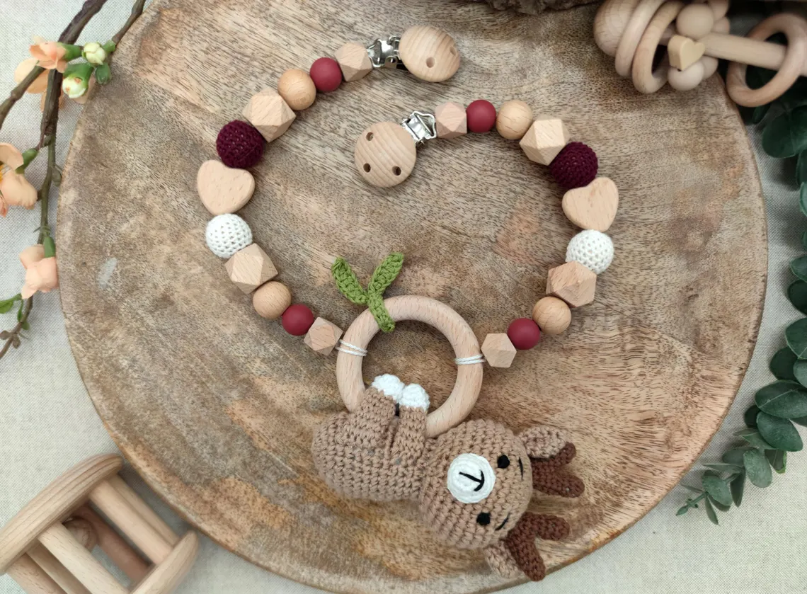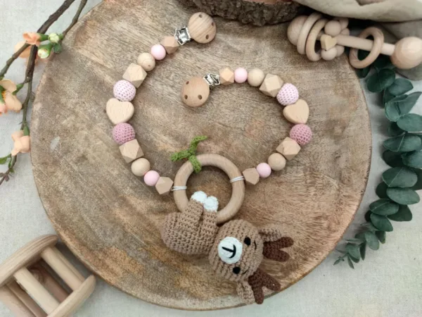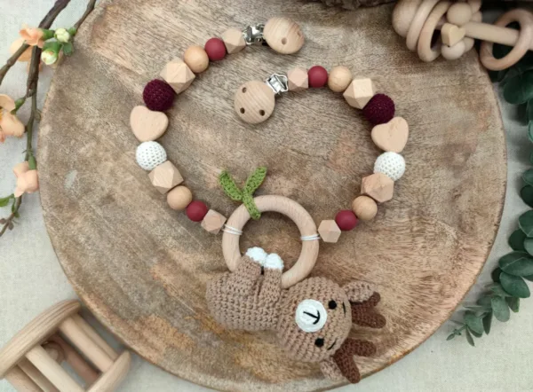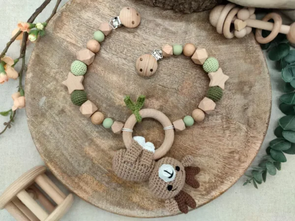 Im Kopf des Rentiers ist eine Rassel eingearbeitet.