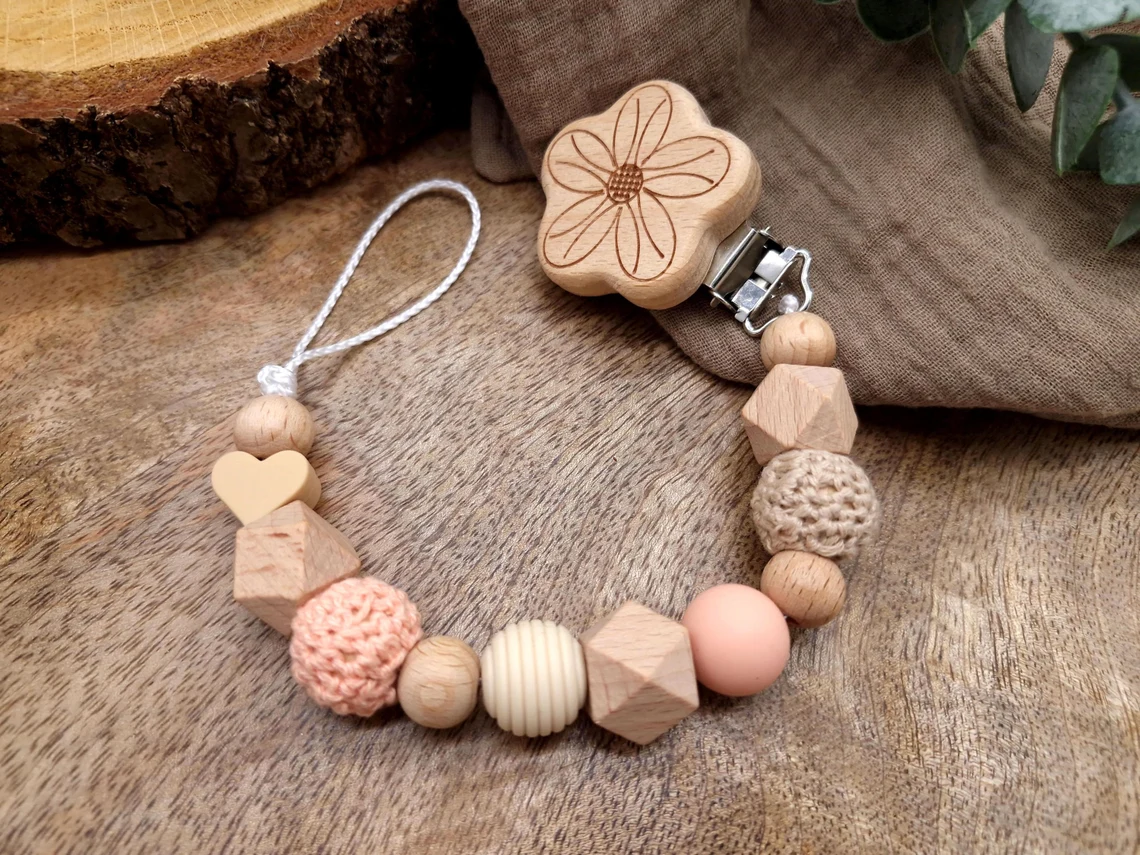 Wunderschöne Schnullerkette aus Holz-, Silikon- und Häkelperlen