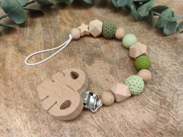 Wunderschöne Schnullerkette aus Holz-, Silikon- und Häkelperlen