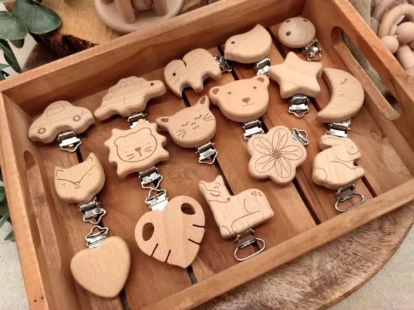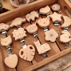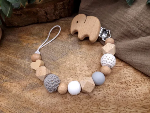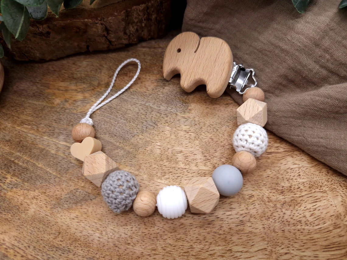 Wunderschöne Schnullerkette aus Holz-, Silikon- und Häkelperlen